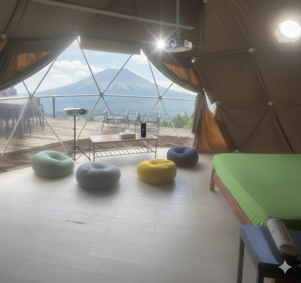 テント内は写真の通り普通のテントより広く、ベッドにソファーも完備しております。